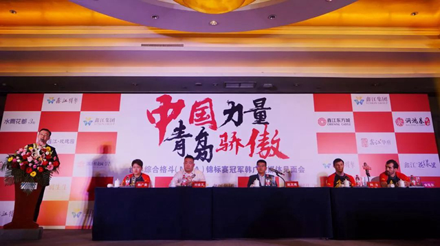 媒体提问环节,首先由鑫江集团副总经理赵文博,向记者详细解答了鑫江集团在体育文化事业上的发展理念。他表示:鑫江集团作为青岛本土企业,深耕青岛24年,目前已形成了集房地产开发、商业开发运营、珠宝、金融、体育文化、公共事业7大板块于一体的多元化集团企业。2018年集团年销售产值101亿元,上缴税费7.03亿元。鑫江搏击俱乐部是集团体育文化板块的重要组成部分,韩广美代表国家队获得世界综合格斗锦标赛冠军,不仅是鑫江集团的荣誉,更是每一位国人的荣誉。鑫江集团的每一个业务板块在今后的发展中,都应像韩广美一样展现出拼搏、奋斗的精气神,为青岛,为每一位选择鑫江的客户交一份满意的答卷。