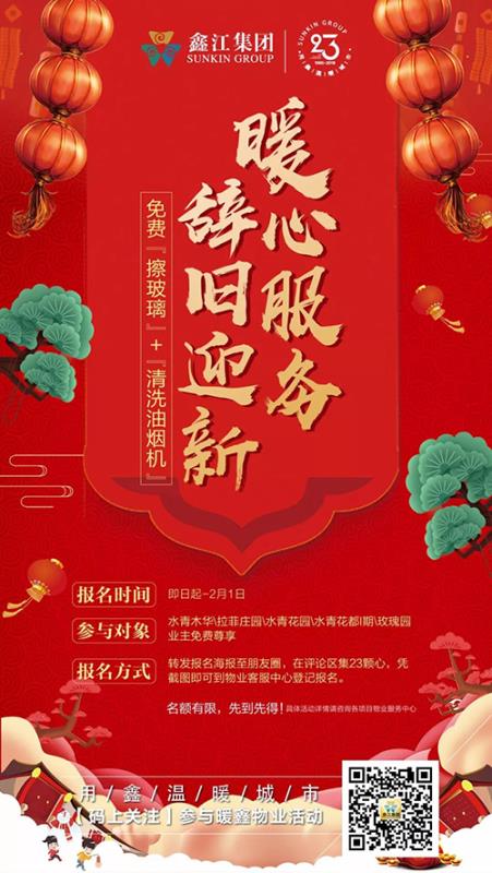 鑫江物业心疼业主们一年来的辛苦忙碌,更是回报您一直以来的支持与信赖。2月1日—2月11日,我们推出免费“擦玻璃”和“清洗油烟机”暖心物业服务,让您解放双手,放松心情,好好享受年底假期,高高兴兴过大年!
