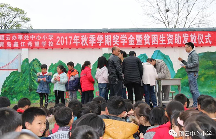 为了贫困生更安心于学业,成绩优秀的学生在新学期能更上一层楼,2018年3月7日下午,顶云中心小学举行“顶云中心小学(青岛鑫江希望小学)2017年秋季学期青岛鑫江慈善基金会贫困生助学金暨奖学金发放仪式”活动。