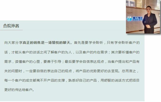 各项目经理也根据自身从业多年的经验向大家进行了细致入微、引人入胜的分享。他们通过一个个真实、生动的案例展示了自己如何不断摸索探寻机会,遇到困难绝不后退,锲而不舍签约成功等一系列过程。这些成功案例充满了正能量,也凝聚着汗水与心血,得到了在听营销人员的共鸣,赢得了阵阵掌声。