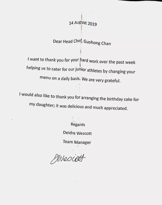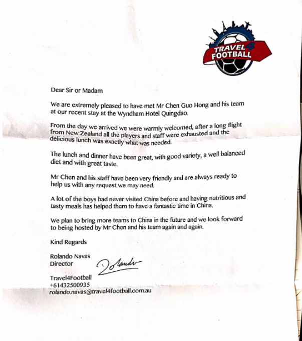 青岛鑫江温德姆酒店团队,辛勤的服务和付出和努力,得到了入住球队的认可。我们收到了来自澳大利亚球队秘书,及新西兰球队理事的书面感谢信。大家对酒店厨师长,及厨师团队表达了亲切的问候与感谢,特别对酒店健康、丰富的食材,搭配均衡的三餐,以及亲情化的服务表达了感谢。新西兰球队理事,更是希望以后在中国的团队,都由温德姆酒店提供服务。