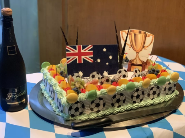 酒店还为球队准备了印有奖杯、足球元素的蛋糕、和香槟,庆祝胜利。