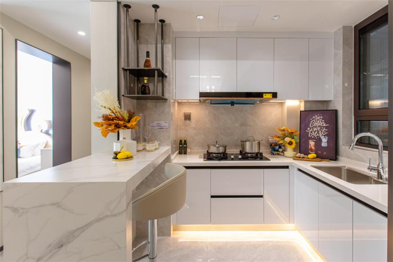 为家人烹饪美食,满足一家人的味蕾。方正空间搭配L型布局,空间实用,黄金动线,流畅操作,半开放式吧台,打造一个便捷早餐、品味下午茶的临时场所,厨房空间早已成为一条拉近夫妻感情距离的隐形纽带。